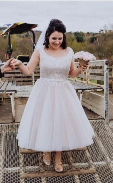1950er Jahre Land Spitze Applikationen Vintage Tee Länge Brautkleid Im Freien GBWD060