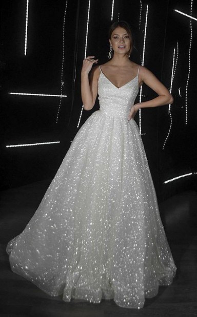 A Line Rückenfreies Brautkleid Mit V-ausschnitt Pailletten Elfenbein Brautkleider Twa2942