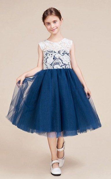 A-Linie Juwel Kurzarm dunkelblaue Spitze Tüll knielangen Kinder Ballkleid (GACH056)