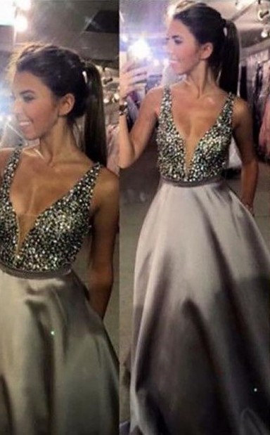 A-linie V-ausschnitt Zug Mit Perlen Satin Kleid JTC10093