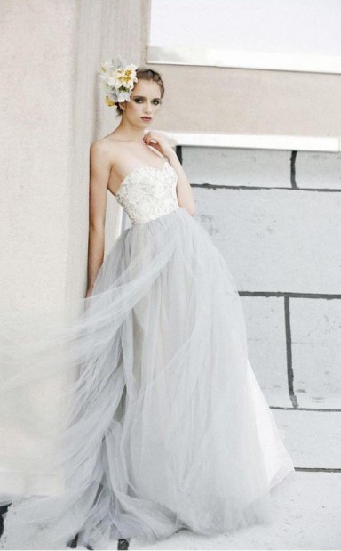 A-linie Weiße Spitze Grauer Tüll Trägerloses Herzförmiges Brautkleid Twa0712
