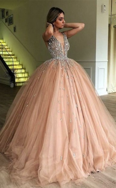 Ballkleid V-ausschnitt Bodenlang Mit Perlen Tüll Kleid JTC18923