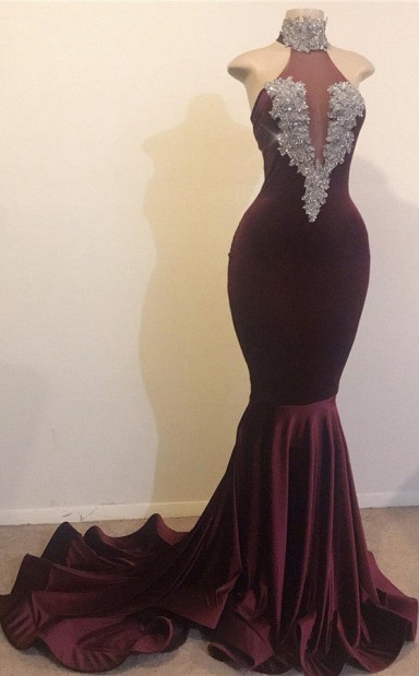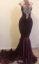 Dunkle Burgunder Meerjungfrau Hohe Hals Silberperlen Promkleider REALS143