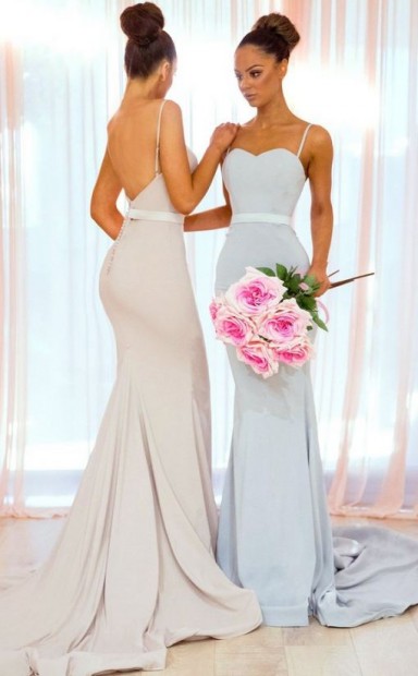 Einfache Lange Meerjungfrau Brautjungfernkleider Spaghettiträger Rückenfreies Hochzeitsfestkleid BED06062