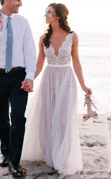 Spaghetti-träger Tiefem V-ausschnitt Strand Brautkleid Mit Applikationen Twa3212