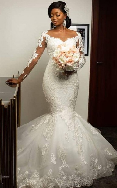 Elfenbein Braut Spitze Langarm Meerjungfrau Transparenten Hals Brautkleid Größe 6-18 Schwarze Bräute GBWD020