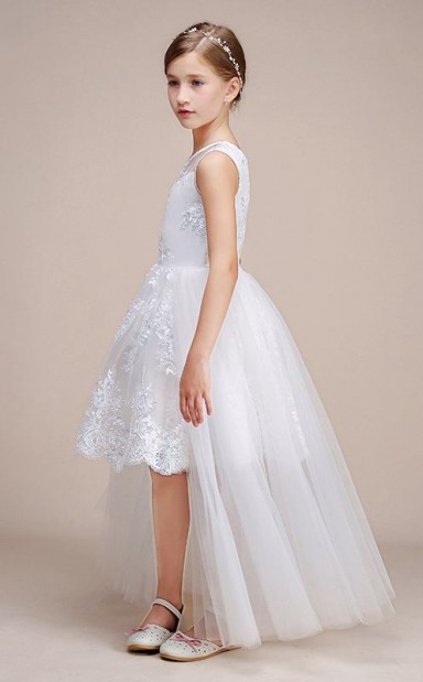 Erschwingliches Weisses Juwel Junior Brautjungfernkleid Hoch Niedrig Festzug Kleid Mit Spitzendetails GBCH054