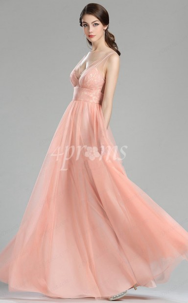Perlrosa Satin Chiffon V-ausschnitt A-linie Bodenlanges Promikleid (GJT3702)