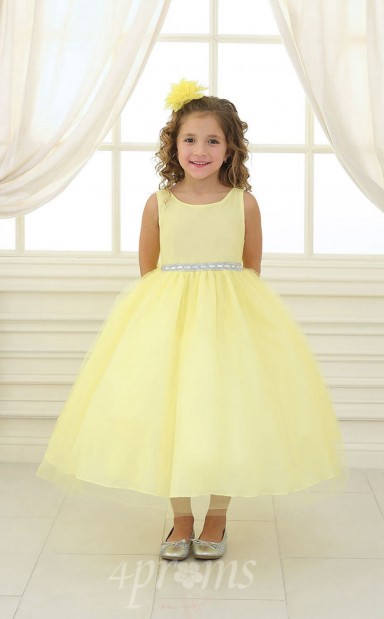 Gelbes Tüll Organza Juwel ärmelloses Tee-länge Prinzessin Kinder Ballkleid (FGD286)
