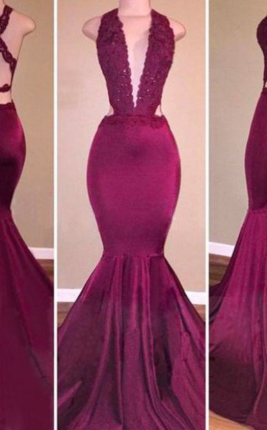 V-ausschnitt Langarm Spitzen Applikationen Spliter Meerjungfrau Abendkleider REALS210