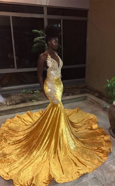 Meerjungfrau V-ausschnitt Gericht Zug Spitze Samt Kleid JTC16663