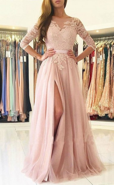 Nude Pink Tüll Bateau Halbarm A-linie Langes Promi-kleid (GJT3752)