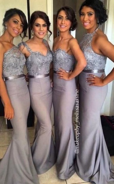 Pailletten Applikationen Drapierte Rüschen Graue Brautjungfernkleider Meerjungfrau Satin Partykleider Party BEO65562