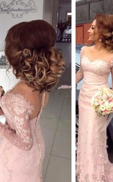 Rosa Transparente Knöpfe Langärmliges Spitzen Etui Applikationen Brautjungfernkleid BEQ62032