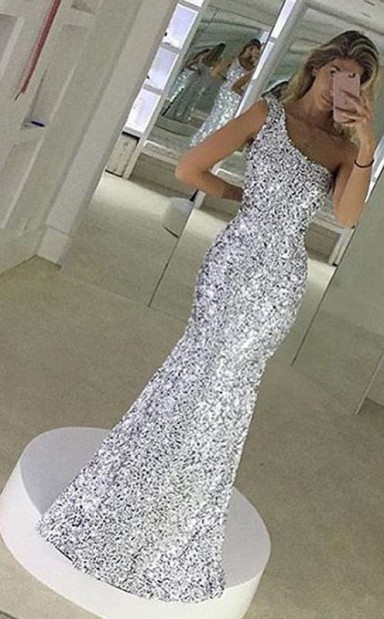 Scheide Einschulter Bodenlang Mit Rüschen Pailletten Kleid JTC19233