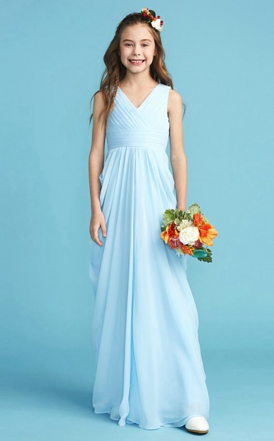 V-Ausschnitt-Himmelblaues Chiffonkleid für Junior-Brautjungfern, Blumenmädchenkleid GJFGD008