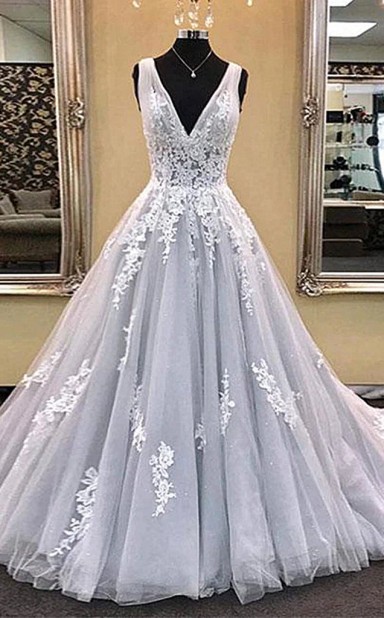 V Hals Hellgrauer Spitzen -promkleid REALS088