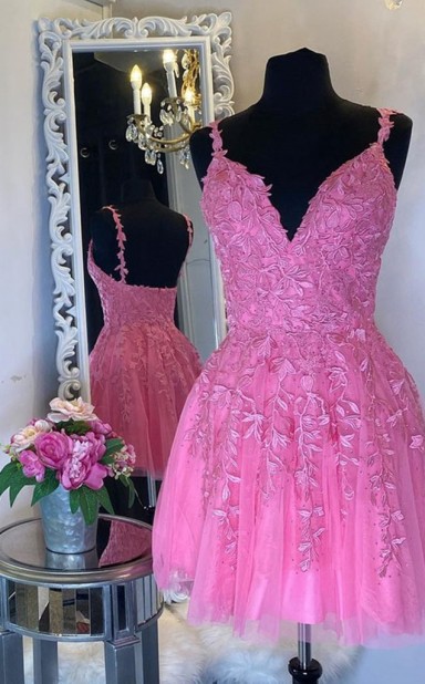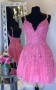 V Hals Kurzer Fuchsia -spitzen -prom -kleid REAL029
